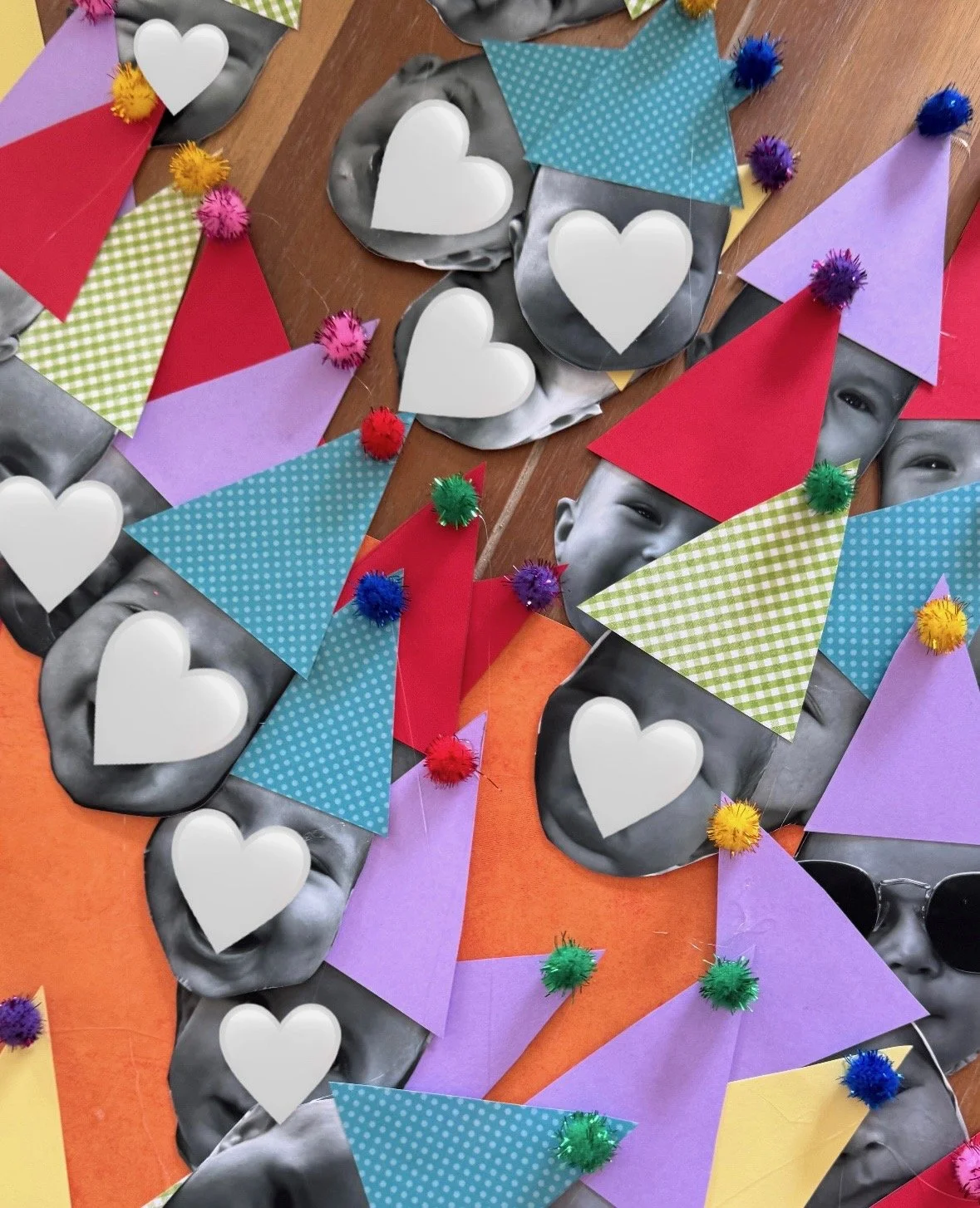 I did a few DIY crafts like this fun birthday hat banner and painted sign. For the banner we just printed out close up, cropped pictures in black and white, and cut them out. Then we hot glue’d the birthday hats to the pictures and hot glue’d those to a piece of ribbon. This craft went quicker than I expected, which was great!