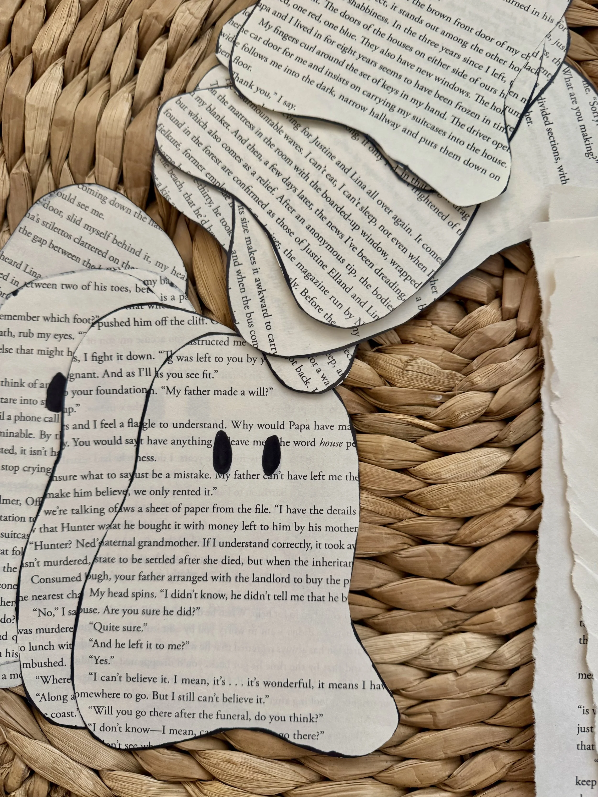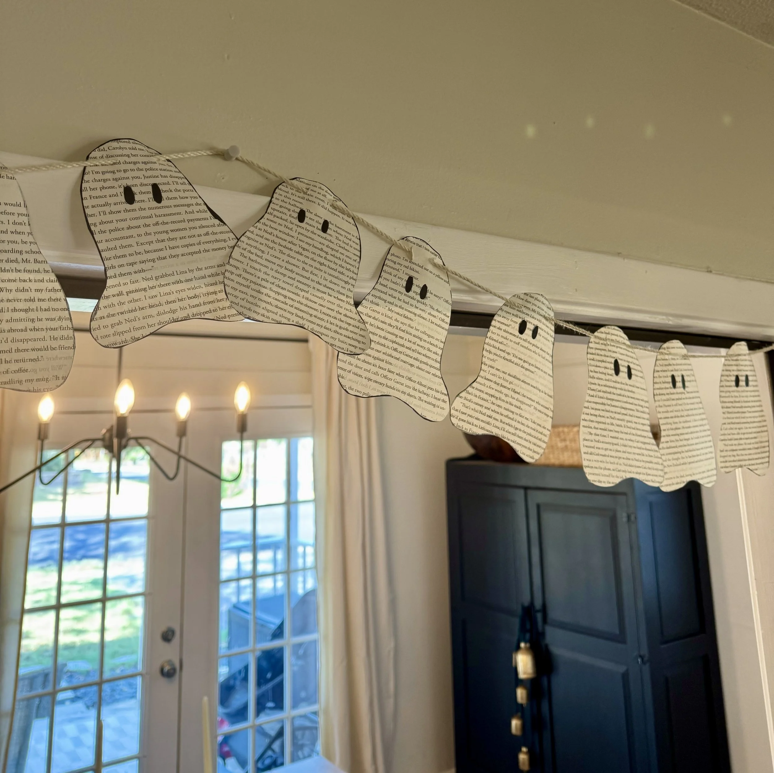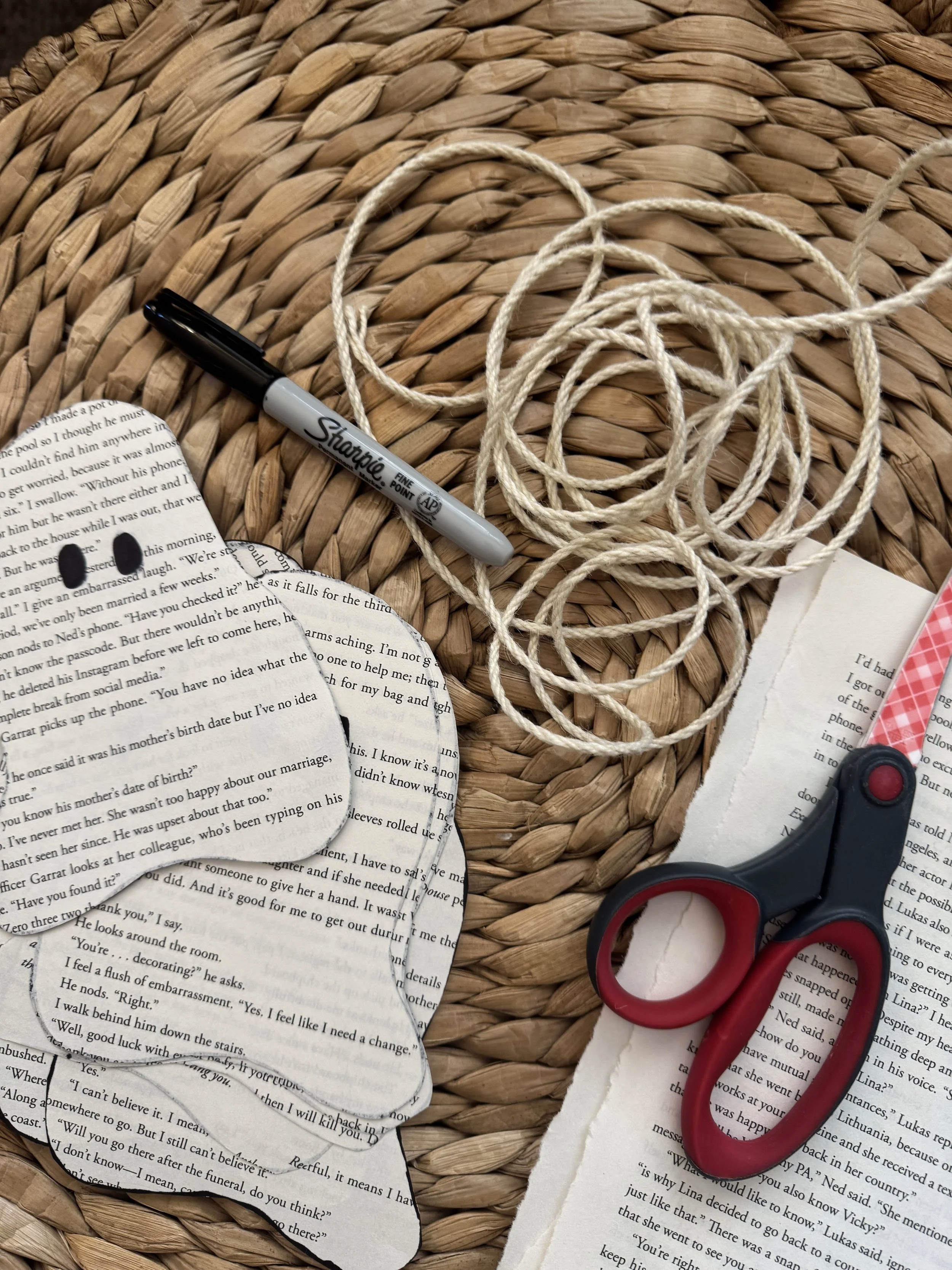 I started by cutting out my template ghost and used that to trace out each of my other ghosts! From there, I cut each one out and drew eyes on with the sharpie. I did eyes on both sides so that the garland would be double-sided.