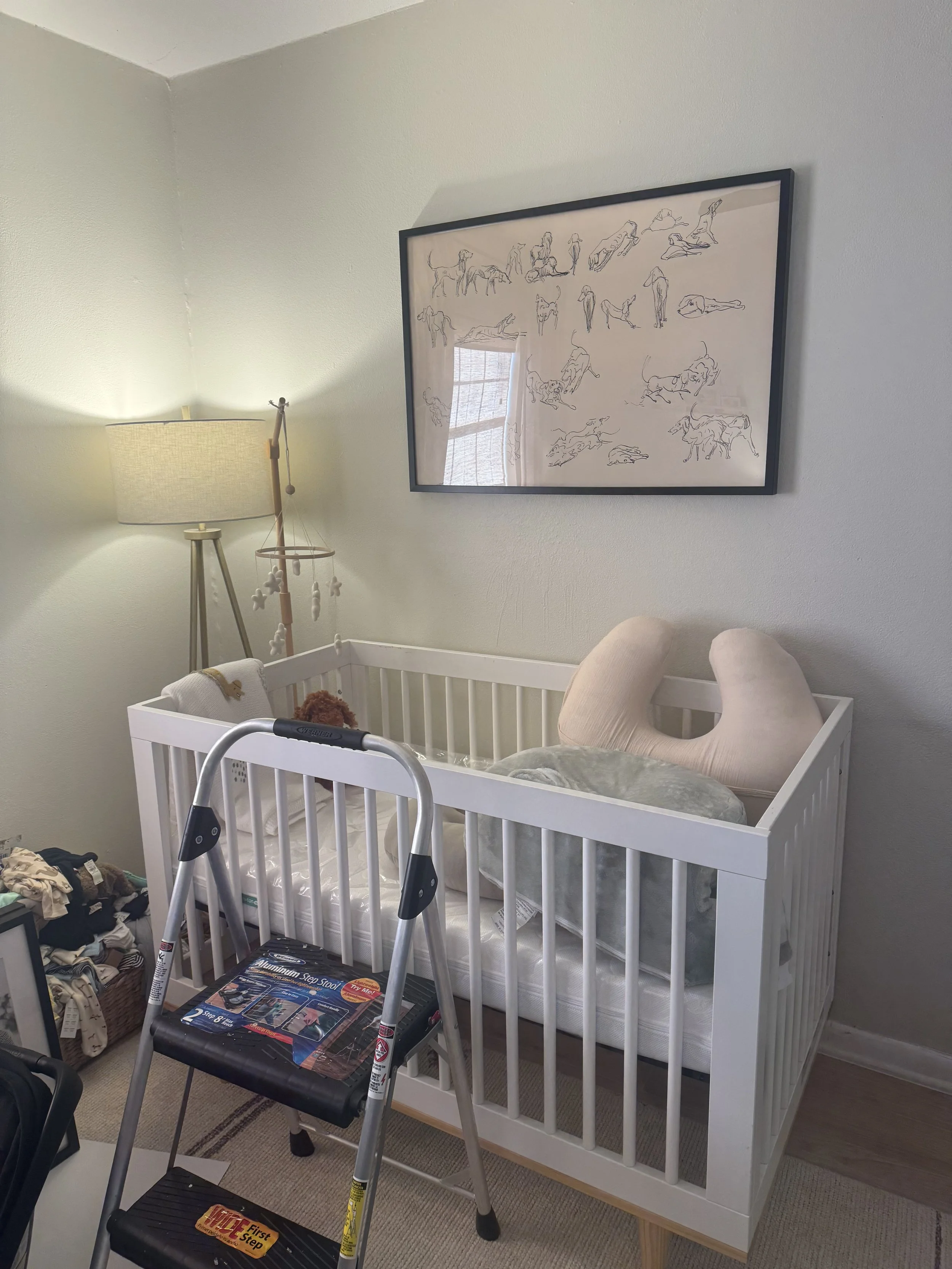 For the longest time, this space became the holding place for all things baby, as we slowly made progress. I also ended up having to separate this precious dog print into two separate frames so that the Nanit could go down the middle.