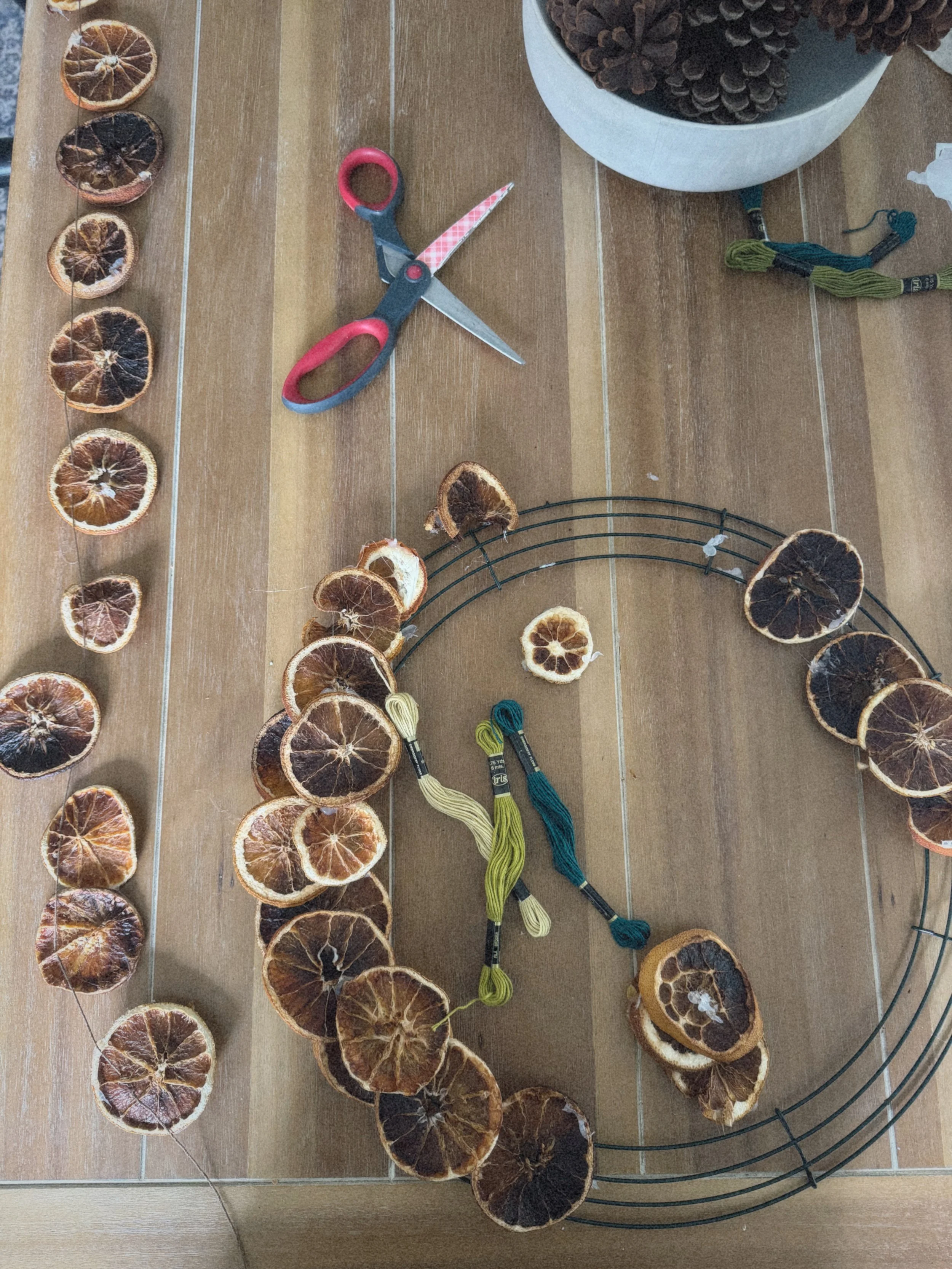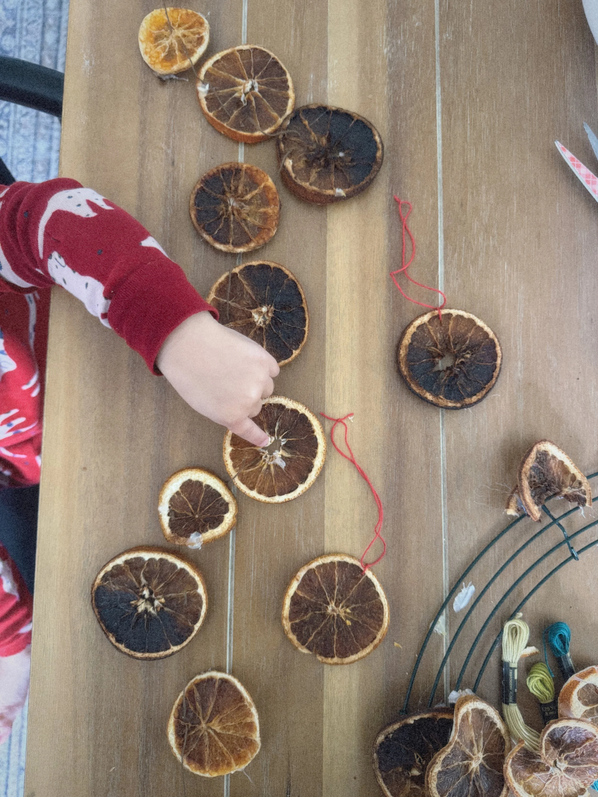 This year, I’m trying not to spend any money on Christmas decorations because it we are being honest, we’ve got more than enough! It can be so tempting to buy more and more each year, especially with all the sales, but this year we are going for a diy’ed and recycled Christmas decoration vibe. I was getting ready to put my orange wreath away and got nervous that it may not keep until next year, so instead of just tossing it, we took the oranges off and made some ornaments and a garland!